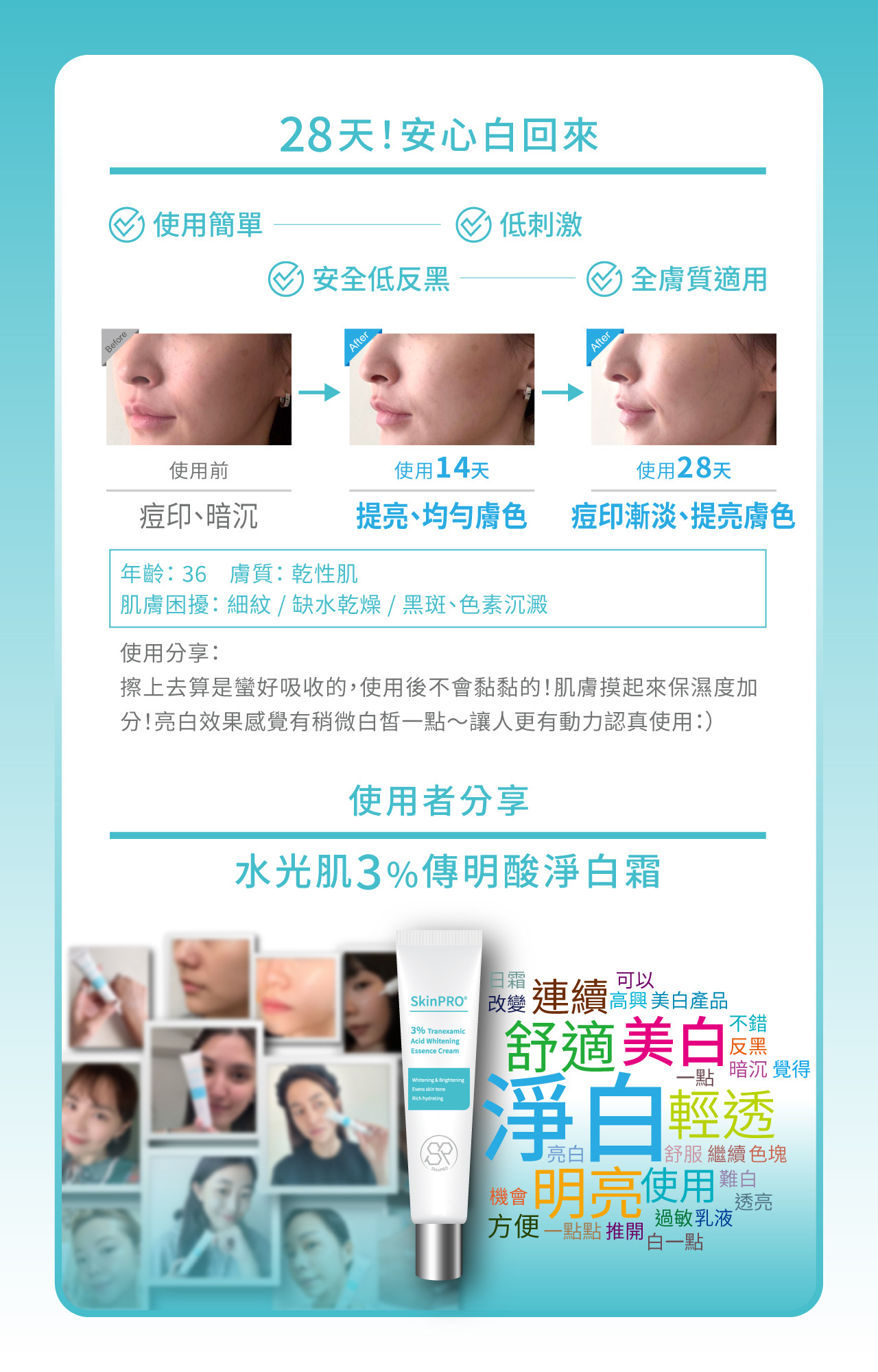 ✅ 使用建議:水光肌 3% 傳明酸淨白霜不含感光成分,正常使用並搭配防曬,不會造成反黑。