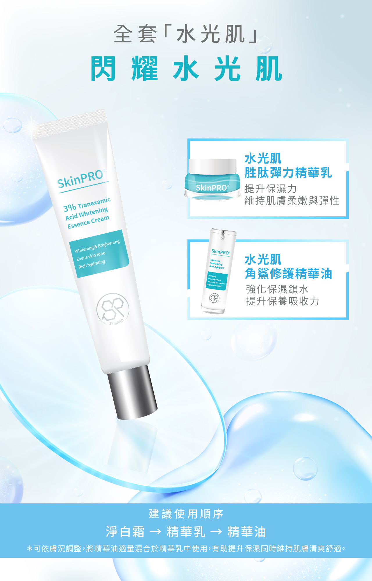 A1. 水光肌3%傳明酸淨白霜以穩定型傳明酸為核心,搭配維他命C衍生物、甘草酸鉀與多重保濕因子,調理膚色不均與暗沉問題,並同步提升肌膚含水量,讓膚觸更顯柔嫩、透亮。肌膚代謝週期約為28天,建議早晚持續使用。
